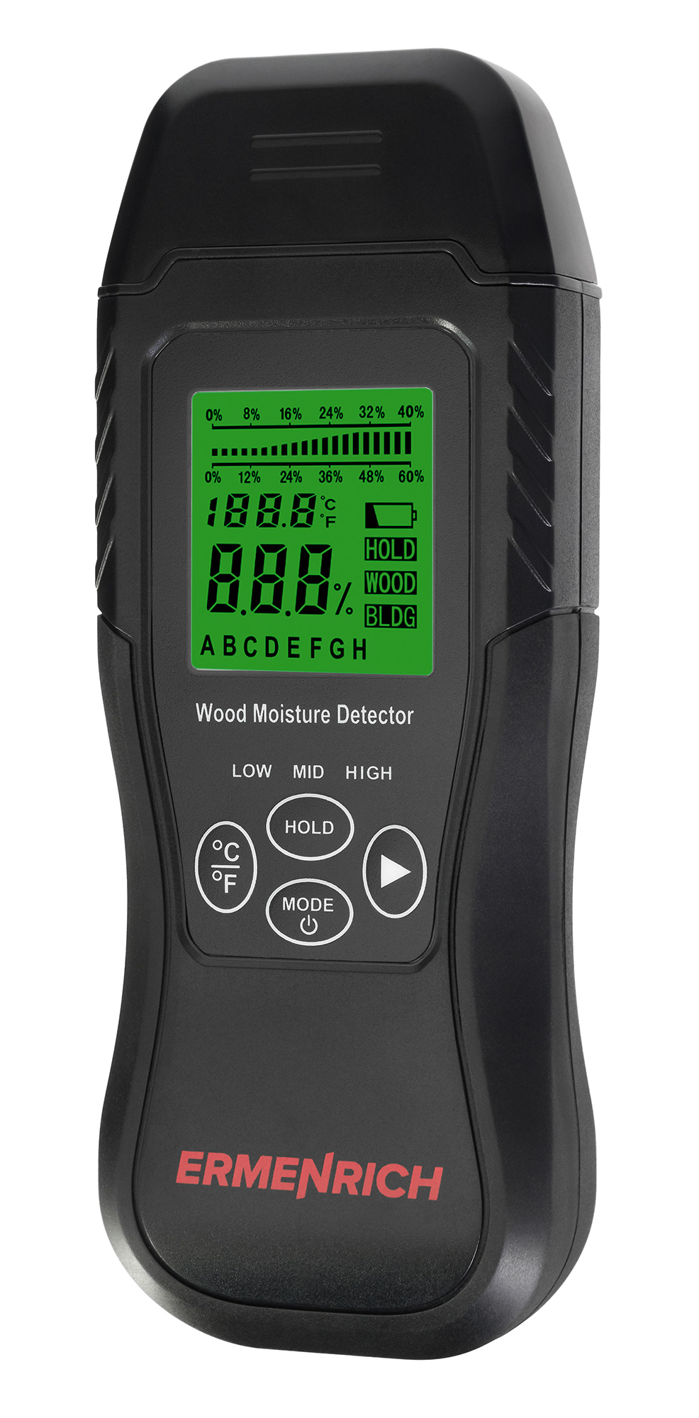 Přenosný detektor vlhkosti (vlhkoměr) Ermenrich Wett MW30 umožňuje rychlé měření vlhkosti stavebních materiálů a dřevěných výrobků. To má význam zejména při nákupu materiálu, ve výrobě, v truhlářství a při údržbě v domácnosti. Přístroj může pracovat s materiály, jako je lepenka, řezivo, beton, omítka atd. Má zabudovaný teploměr, který dokáže měřit teplotu ve dvou jednotkách měření: Celsia a Fahrenheita.