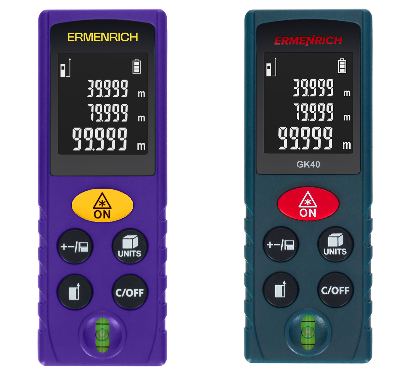 Laserový měřič Ermenrich Reel PLUS GK40 se používá k řešení mnoha stavebních, opravárenských, technických nebo domácích úkolů. Umožňuje provádět přesná měření v rozsahu do 40 metrů a vypočítat objem a plochu. Pro měření v obtížných podmínkách, kdy není možné měřič správně umístit, je k dispozici funkce Pythagorovy věty – pomocí nepřímých měření pomáhá vypočítat vzdálenost k požadovanému bodu. Přístroj má také bublinkovou vodováhu, kterou lze použít pro přesnou instalaci měřiče i jako samostatný nástroj.
